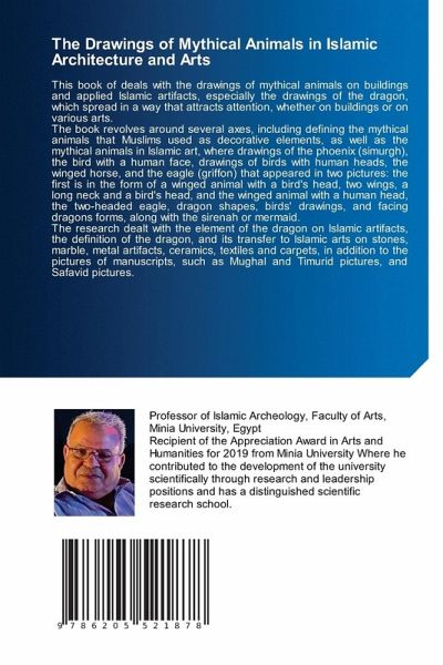 This book of deals with the drawings of mythical animals on buildings and applied Islamic artifacts, especially the drawings of the dragon, which spread in a way that attracts attention, whether on buildings or on various arts.The book revolves around several axes, including defining the mythical animals that Muslims used as decorative elements, as well as the mythical animals in Islamic art, where drawings of the phoenix (simurgh), the bird with a human face, drawings of birds with human heads, the winged horse, and the eagle (griffon) that appeared in two pictures: the first is in the form of a winged animal with a bird's head, two wings, a long neck and a bird's head, and the winged animal with a human head, the two-headed eagle, dragon shapes, birds' drawings, and facing dragons forms, along with the sirenah or mermaid.The research dealt with the element of the dragon on Islamic artifacts, the definition of the dragon, and its transfer to Islamic arts on stones, marble, metalartifacts, ceramics, textiles and carpets, in addition to the pictures of manuscripts, such as Mughal and Timurid pictures, and Safavid pictures.