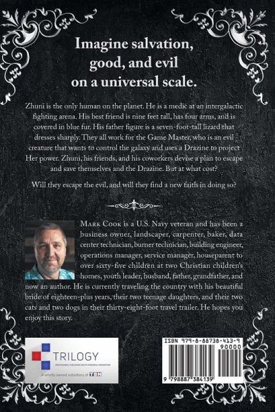 Imagine salvation, good, and evil on a universal scale. ¿¿Zhuni is the only human on the planet. He is a medic at an intergalactic fighting arena. His best friend is nine feet tall, has four arms, and is covered in blue fur. His father figure is a seven-foot-tall lizard that dresses sharply. They all work for the Game Master, who is an evil creature that wants to control the galaxy and uses a Drazine to project Her power. Zhuni, his friends, and his coworkers devise a plan to escape and save themselves and the Drazine. But at what cost? Will they escape the evil, and will they find a new faith in doing so?…mehr