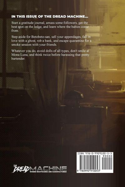 IN THIS ISSUE OF THE DREAD MACHINE... Start a gratitude journal, amass some followers, get the best spot on the ledge, and learn where the babies come from. Step aside for Betobeto-san, sell your appendages, fall in love with a ghost, rob a bank, and escape quarantine for a smoke session with your friends. Whatever you do, avoid dolls of all types, don't smile at Mona Luna, and think twice before harassing that pretty bartender. Featuring original fiction and poetry by: J.L. Akagi Colleen Anderson Rhonda Parrish & Beth Cato Nick Chianese Patrick Hurley Ai Jiang Christina Ladd Daria Lavelle Martin Merino Michael Meyerhofer Justin Permenter Stephen S. Power Sam Rebelein Belicia Rhea Josh Rountree Justen Russell Crystal Sidell Mark Towse Dawn Vogel Maura Yzmore