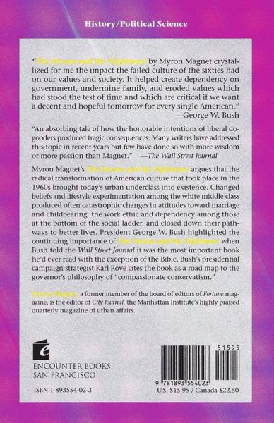 Myron Magnet's The Dream and the Nightmare argues that the radical transformation of American culture that took place in the 1960s brought today's underclass-overwhelmingly urban, dismayingly minority-into existence. Lifestyle experimentation among the white middle class produced often catastrophic changes in attitudes toward marriage and parenting, the work ethic and dependency in those at the bottom of the social ladder, and closed down their exits to the middle class.