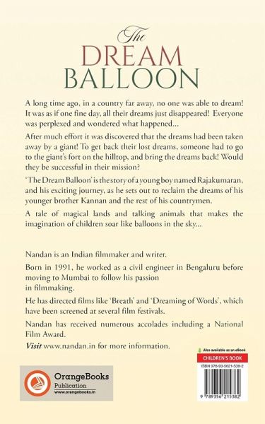A long time ago, in a country far away, no one was able to dream! It was as if one fine day, all their dreams just disappeared! Everyone was perplexed and wondered what happened... After much effort, it was discovered that the dreams had been taken away by a giant! To get back their lost dreams, someone had to go to the giant's fort on the hilltop, and bring the dreams back! Would they be successful in their mission? 'The Dream Balloon' is the story of a young boy named Rajakumaran, and his exciting journey, as he sets out to reclaim the dreams of his younger brother Kannan and the rest of his countrymen. A tale of magical lands and talking animals that makes the imagination of children soar like balloons in the sky...