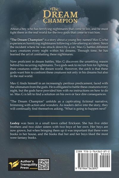 About a boy who has terrifying nightmares that come to life, and he must fight them in the real world for the two gods that come to visit him."The Dream Champion" is a story about a young boy named Max G who experiences horrifying nightmares following a life-altering accident. Since the incident where he was struck down by a car, Max G battles different scary creatures every night within his dreams. Through time, he has learned the art of combatting these nightmares.Now proficient in dream battles, Max G discovers the unsettling reason behind his recurring nightmares. Two gods seek to recruit him for fighting their creatures within the dream world. However, the catch is that these gods want him to confront these creatures not only in his dreams but also in the real world.Max G finds himself in an increasingly perilous predicament, faced with the ultimatum from the gods. He is obligated to battle these creatures every night, but the gods have provided him with no instructions on how to do so. Max G is left to find a solution on his own or face dire consequences."The Dream Champion" unfolds as a captivating fictional narrative, brimming with action and wonders. As readers delve into the story, they will continually find themselves asking, "What is going to happen next?