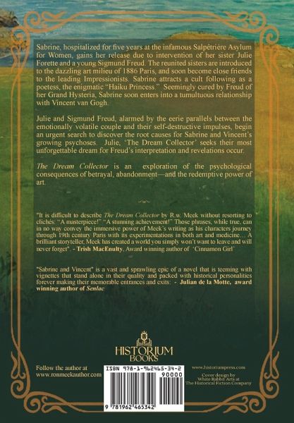 Winner of the Bronze Medal for Best Historical Fiction - Literary Category - HFC Book of the Year 2022 Sabrine, hospitalized for five years at the infamous Salpêtrière Asylum for Women, gains her release due to intervention of her sister Julie Forette and a young Sigmund Freud. The reunited sisters are introduced to the dazzling art milieu of 1886 Paris, and soon become close friends to the leading Impressionists. Sabrine attracts a cult following as a poetess, the enigmatic "Haiku Princess." Seemingly cured by Freud of her Grand Hysteria, Sabrine soon enters into a tumultuous relationship with Vincent van Gogh. Jule and Sigmund Freud, alarmed by the eerie parallels between the emotionally volatile couple and their self-destructive impulses, begin an urgent search to discover the root causes for Sabrine and Vincent's growing psychoses. Julie, 'The Dream Collector' seeks their most unforgettable dream for Freud's interpretation and revelations occur. The Dream Collector is an exploration of the psychological consequences of betrayal, abandonment--and the redemptive power of art.