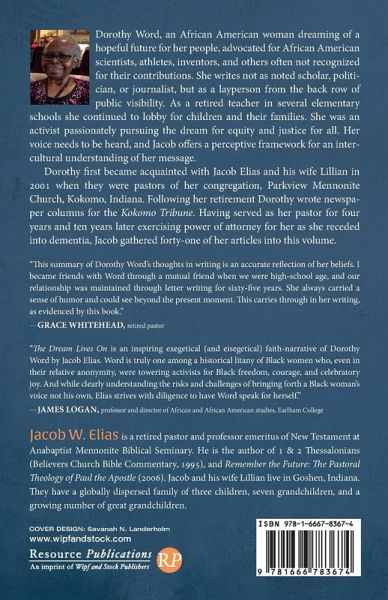 Dorothy Word, an African American woman dreaming of a hopeful future for her people, advocated for African American scientists, athletes, inventors, and others often not recognized for their contributions. She writes not as noted scholar, politician, or journalist, but as a layperson from the back row of public visibility. As a retired teacher in several elementary schools she continued to lobby for children and their families. She was an activist passionately pursuing the dream for equity and justice for all. Her voice needs to be heard, and Jacob offers a perceptive framework for an intercultural understanding of her message. Dorothy first became acquainted with Jacob Elias and his wife Lillian in 2001 when they were pastors of her congregation, Parkview Mennonite Church, Kokomo, Indiana. Following her retirement Dorothy wrote newspaper columns for the Kokomo Tribune. Having served as her pastor for four years and ten years later exercising power of attorney for her as she receded into dementia, Jacob gathered forty-one of her articles into this volume.