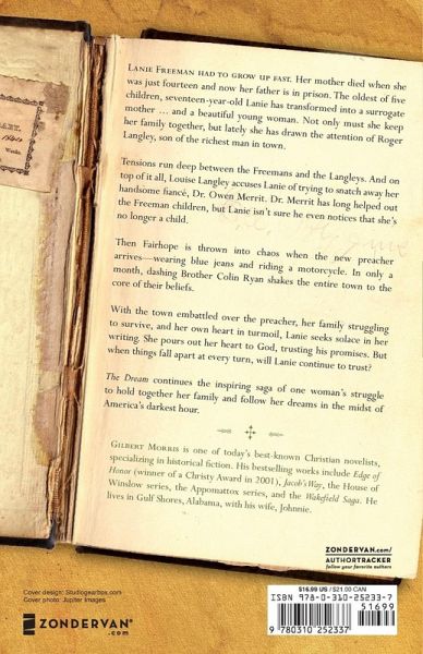Lanie Freeman had to grow up fast. Her mother died when she was just fourteen and now her father is in prison. The oldest of five children, seventeen-year-old Lanie has transformed into a surrogate mother ... and a beautiful young woman. Not only must she keep her family together, but lately she has drawn the attention of Roger Langley, son of the richest man in town. Tensions run deep between the Freemans and the Langleys. And on top of it all, Louise Langley accuses Lanie of trying to snatch away her handsome fiance, Dr. Owen Merrit. Dr. Merrit has long helped out the Freeman children, but Lanie isn't sure he even notices that she's no longer a child. Then Fairhope is thrown into chaos when the new preacher arrives---wearing blue jeans and riding a motorcycle. In only a month, dashing Brother Colin Ryan shakes the entire town to the core of their beliefs. With the town embattled over the preacher, her family struggling to survive, and her own heart in turmoil, Lanie seeks solace in her writing. She pours out her heart to God, trusting his promises. But when things fall apart at every turn, will Lanie continue to trust? The Dream continues the inspiring saga of one woman's struggle to hold together her family and follow her dreams in the midst of America's darkest hour.