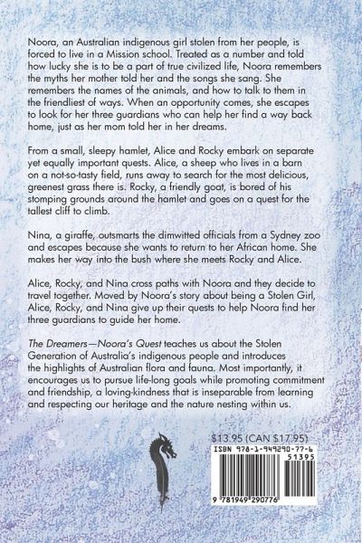 Noora, an Australian indigenous girl stolen from her people, is forced to live in a Mission school. Treated as a number and told how lucky she is to be a part of true civilized life, Noora remembers the myths her mother told her and the songs she sang. She remembers the names of the animals, and how to talk to them in the friendliest of ways. When an opportunity comes, she escapes to look for her three guardians who can help her find a way back home, just as her mom told her in her dreams. From a small, sleepy hamlet, Alice and Rocky embark on separate yet equally important quests. Alice, a sheep who lives in a barn on a not-so-tasty field, runs away to search for the most delicious, greenest grass there is. Rocky, a friendly goat, is bored of his stomping grounds around the hamlet and goes on a quest for the tallest cliff to climb. Nina, a giraffe, outsmarts the dimwitted officials from a Sydney zoo and escapes because she wants to return to her African home. She makes her way into the bush where she meets Rocky and Alice. Alice, Rocky, and Nina cross paths with Noora and they decide to travel together. Moved by Noora's story about being a Stolen Girl, Alice, Rocky, and Nina give up their quests to help Noora find her three guardians to guide her home. The Dreamers-Noora's Quest teaches us about the Stolen Generation of Australia's indigenous people and introduces the highlights of Australian flora and fauna. Most importantly, it encourages us to pursue life-long goals while promoting commitment and friendship, a loving-kindness that is inseparable from learning and respecting our heritage and the nature nesting within us.