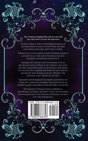 She wanted a magical life but no one told her she'd have to save the universe! Normal, ordinary, thirty-something Sara dreams of meeting a unicorn, but in a twist of fate, she finds expectations and reality don't always match. Whisked away to the magical world of Palantia, thanks to a mysterious cat, Sara meets Terentius, a unicorn decidedly unimpressed at her arrival. Amongst the turmoil of the Awakening, with an unexpected enemy lurking in the shadows, Sara joins up with a makeshift group of adventurers, and battles to overcome her crippling self-doubt. It's up to Sara to become the new Dreamer and save Palantia - the universe, even! - before it's too late. Unprepared and ill-equipped, bearing the expectations of a whole new world on her shoulders, Sara finds out she can actually be quite extraordinary if she just believes in herself. The Dreamer's Wish (previously published as Somniloquy) is a fantasy adventure where the boundaries between good and evil are blurred, and dreams can have very real consequences.