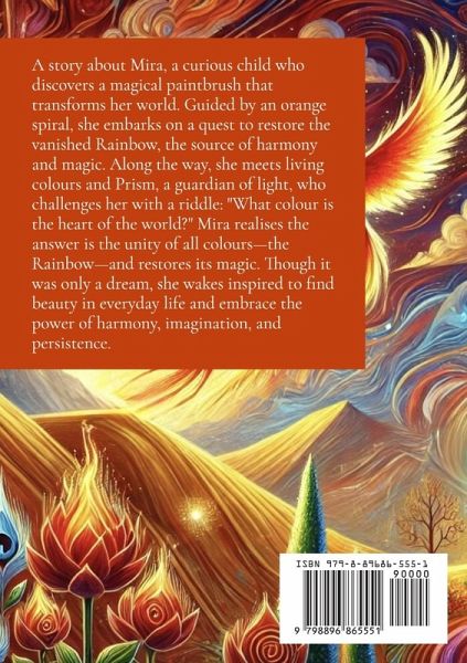 Mira, a curious child, discovers a magical paintbrush that transforms her world into a vibrant landscape. Guided by an orange spiral, she embarks on a journey to restore the Rainbow, the source of harmony and magic, which has vanished. Along the way, she encounters vivid, living colours and meets Prism, a guardian of light, who poses a riddle: "What colour is the heart of the world?" Mira realizes the answer is the unity of all colours-the Rainbow-and restores its magic. Even though it turns out to be a dream, Mira is inspired to find beauty in everyday moments, like a sunrise or a rain puddle. Her dream of the rainbow taught her to value harmony and uniqueness, showing her how bringing people together can create something extraordinary. It also reinforces the importance of solving problems with thoughtfulness, imagination, and persistence.