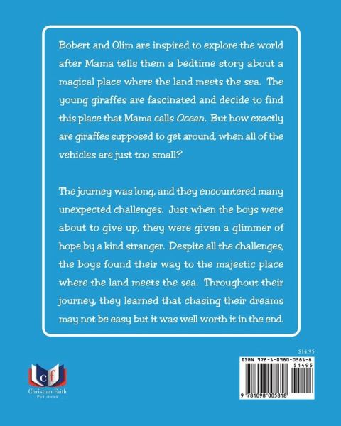 Bobert and Olim are inspired to explore the world after Mama tells them a bedtime story about a magical place where the land meets the sea. The young giraffes are fascinated and decide to find this place that Mama calls Ocean. But how exactly are giraffes supposed to get around, when all of the vehicles are just too small? The journey was long, and they encountered many unexpected challenges. Just when the boys were about to give up, they were given a glimmer of hope by a kind stranger. Despite all the challenges, the boys found their way to the majestic place where the land meets the sea. Throughout their journey, they learned that chasing their dreams may not be easy but it was well worth it in the end.