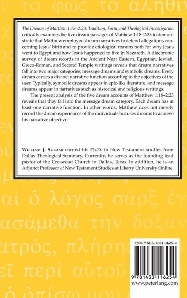 The Dreams of Matthew 1:18-2:23: Tradition, Form, and Theological Investigation critically examines the five dream passages of Matthew 1:18-2:23 to demonstrate that Matthew employed dream narratives to defend allegations concerning Jesus' birth and to provide etiological reasons both for why Jesus went to Egypt and how Jesus happened to live in Nazareth. A diachronic survey of dream records in the Ancient Near Eastern, Egyptian, Jewish, Greco-Roman, and Second Temple writings reveals that dream narratives fall into two major categories: message dreams and symbolic dreams. Every dream carries a distinct narrative function according to the objectives of the user. Typically, symbolic dreams appear in epic-like literature, and message dreams appear in narratives such as historical and religious writings.