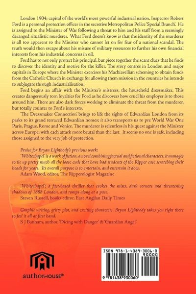 London 1904: capital of the world's most powerful industrial nation. Inspector Robert Ford is a protection officer in the Metropolitan Police 'Special Branch'. He is assigned to the Minister of War following a threat to him and his staff from a seemingly deranged ritualistic murderer. What Ford doesn't know is that the identity of the murderer is all too apparent to the Minister who cannot let on for fear of a national scandal. The truth would then escape about his misuse of military resources to further his own financial interests from his industrial concerns in oil. Ford has to not only protect his principal, but piece together the scant clues that he finds to discover the identity and motive for the killer. The story centres in London and major capitals in Europe where the Minister exercises his Machiavellian scheming to obtain funds from the Catholic Church in exchange for allowing them mission in the countries he intends to subjugate through industrialisation. Ford begins an affair with the Minister's mistress, the household dressmaker. This creates dangerously torn loyalties for Ford as he discovers how cruel his employer is to those around him. There are also dark forces working to eliminate the threat from the murderer, but totally counter to Ford's interests. With flashbacks to Robert Ford's life prior to his involvement in the infamous 'Whitechapel Murders' we discover the individual that he is; dogged in his determination to succeed and survive against any odds. 'The Dressmaker Connection' brings to life the sights of Edwardian London and transports us to pre World War One Paris, Prague, Rome and Venice. The murderer is relentless in his quest against the Minister with each attack more brutal than the last. It seems no one is safe, including those assigned to the very job of protection.