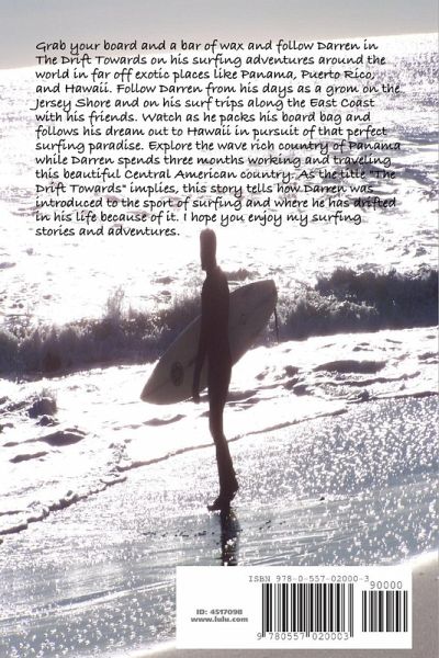 Grab your board and a bar of wax and follow Darren in The Drift Towards on his surfing adventures around the world in far off exotic places like Panama, Puerto Rico, and Hawaii. Follow Darren from his days as a grom on the Jersey Shore and on his surf trips along the East Coast with his friends. Watch as he packs his board bag and follows his dream out to Hawaii in pursuit of that perfect surfing paradise. Explore the wave rich country of Panama while Darren spends three months working and traveling this beautiful Central American country. As the title "The Drift Towards" implies, this story tells how Darren was introduced to the sport of surfing and where he has drifted in his life because of it. I hope you enjoy my surfing stories and adventures.