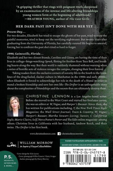 Megan Abbott meets M.O. Walsh in Christine Lennon's compelling debut novel about a group of friends on the cusp of graduating from college when their lives are irrevocably changed by a brutal act of violence. Present Day For two decades, Elizabeth has tried to escape the ghosts of her pasttried to erase the painful memoriestried to keep out the terrifying nightmares. But twenty years after graduating from the University of Florida, her carefully curated life begins to unravel, forcing her to confront the past shes tried so hard to forget. 1990s, Gainesville, Florida Elizabeth and her two closest friends, Caroline and Ginny, are having the time of their lives in collegebinge watching Oprah, flirting for freebies from Taco Bell, and breaking hearts along the way. But without warning, their world is suddenly shattered when a series of horrific acts of violence ravage the campus, changing their lives forever. Sweeping readers from the exclusive corners of sorority life in the South to the frontlines of the drug-fueled, slacker culture in Manhattan in the 90s and early 00s, when Elizabeth is forced to acknowledge her role in the death of a friend in order to mend a broken friendship and save her own life, The Drifter is an unforgettable story about the complexities of friendships and the secrets that can ultimately destroy us.