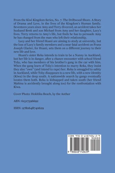 From the Kiwi Kingdom Series No. 7. A story of drama and love, in the lives of the Kiwi Kingdom's Human family. Seventeen years since Amy and Terry divorced, an accident takes her husband Brett and son Michael from Amy and her daughter Lucy's lives. Terry returns to Amy's life, but finds he has to persuade Amy he has changed from the man who left their relationship. Lucy and her friend Hoani are aiming to study at university, but the loss of lucy's family members and a near fatal accident on Franz Joseph Glacier for Hoani, sets them on a different journey to their new life and love. Hoani's sister Reka intends to train to be a Nanny in Auckland; But her life is in danger, after a chance encounter with school friend Toby, who has members of his brother's gang in his car with him. When the gang learn of toby's intention to marry Reka, they insist they also "own" (and intend to rape) her. Reka is smuggled to safety in Auckland, while Toby disappears to a new life, with a new identity (Kiwa) in the deep south. A nationwide search by gangs eventually locates them both. Reka is kidnapped and taken south ( her friend Mahina is accidently brought along too) for the confrontation with Kiwa.