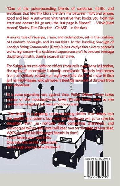 "One of the pulse-pounding blends of suspense, thrills, and emotions that literally blurs the thin line between right and wrong, good and bad. A gut-wrenching narrative that hooks you from the start and doesn't let go until the last page is flipped"Vilok (Hari Anand) Shetty, Film Director - CHASE - in the dark. A murky tale of revenge, crime, and redemption, set in the confines of London's boroughs and its outskirts. In the bustling borough of London, Wing Commander (Retd) Suhas Vaidya faces every parent's worst nightmare-the sudden disappearance of his beloved teenage daughter, Shruthi, during a casual car drive. For Suhas, a retired defence officer from India now living in London, the agony of uncertainty is almost unbearable. The only lead comes from an unlikely source-an eight-year-old deaf and mute British girl named Maggie, who glimpses a fleeting moment of distress from her school bus. In a pulse-pounding race against time, Police Officer Jenny takes charge of the investigation. Her unwavering determination, intelligence, and resilience drive her to go all out to bring Shruthi home, even as she carries the weight of her own emotional scars. "The Drive" is a gripping, nerve-wracking thriller that delves into the depths of a father's love and the lengths he will go to save his daughter. It is more than a thriller; it's a pulse-pounding adventure into the heart of darkness, where love and determination clash with malevolence. With an intricate plot, compelling characters, and unexpected twists and turns at the blink of an eye, this novel will keep you on the edge of your seat. Will Suhas find his little angel Shruthi in time? Dive into this electrifying adventure and find out-because in the darkest moments, even a glimmer of hope can light the way forward.