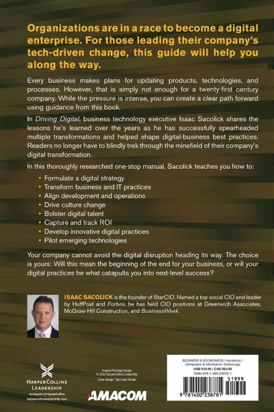 Organizations are in a race to become a digital enterprise. For those leading their company's tech-driven change, this guide will help you along the way. Every business makes plans for updating products, technologies, and processes. However, that is simply not enough for a twenty-first century company. While the pressure is intense, you can create a clear path forward using guidance from this book. In Driving Digital, business technology executive Isaac Sacolick shares the lessons he's learned over the years as he has successfully spearheaded multiple transformations and helped shape digital-business best practices. You no longer have to blindly trek through the mine field of their company's digital transformation. In this thoroughly researched one-stop manual, Sacolick teaches you how to: Formulate a digital strategy Transform business and IT practices Align development and operations Drive culture change Bolster digital talent Capture and track ROI Develop innovative digital practices Pilot emerging technologies Your company cannot avoid the digital disruption heading its way. The choice is yours: Will this mean the beginning of the end for your business, or will your digital practices be what catapults you into next-level success?