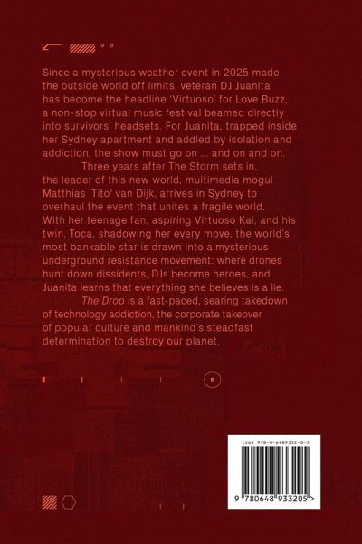 A shattered planet. A superstar DJ. Her biggest fan. And one monumental secret. Since a mysterious weather event in 2025 made the outside world off limits, veteran DJ Juanita has become the headline 'Virtuoso' for Love Buzz, a non-stop virtual music festival beamed directly into survivors' headsets. For Juanita, trapped inside her Sydney apartment and addled by isolation and addiction, the show must go on - and on and on. Three years after The Storm sets in, the leader of this new world, multimedia mogul Matthias 'Tito' van Dijk, arrives in Sydney to overhaul the event that unites a fragile world. With her teenage fan, aspiring Virtuoso Kai, and his twin, Toca, shadowing her every move, the world's most bankable star is drawn into a mysterious underground resistance movement: where drones hunt down dissidents, DJs become heroes, and Juanita learns that everything she believes is a lie. The Drop is a fast-paced, searing takedown of technology addiction, the corporate takeover of popular culture and mankind's steadfast determination to destroy our planet. SOUNDS LIKE: Ready Player One and The Matrix going clubbing in the Black Mirror universe.