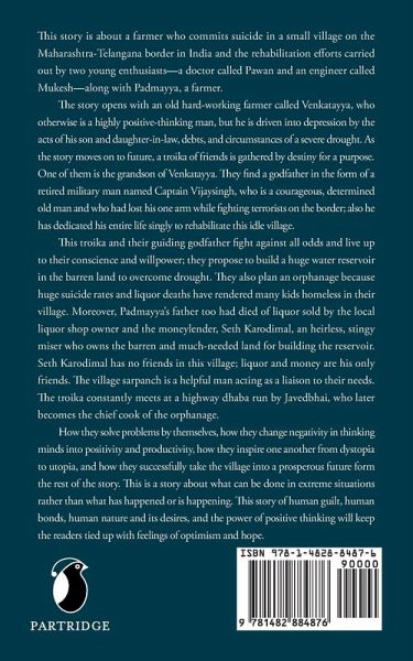 This story is about a farmer who commits suicide in a small village on the Maharashtra-Telangana border in India and the rehabilitation efforts carried out by two young enthusiasts-a doctor called Pawan and an engineer called Mukesh-along with Padmayya, a farmer. The story opens with an old hard-working farmer called Venkatayya, who otherwise is a highly positive-thinking man, but he is driven into depression by the acts of his son and daughter-in-law, debts, and circumstances of a severe drought. As the story moves on to future, a troika of friends is gathered by destiny for a purpose. One of them is the grandson of Venkatayya. They find a godfather in the form of a retired military man named Captain Vijaysingh, who is a courageous, determined old man and who had lost his one arm while fighting terrorists on the border; also he has dedicated his entire life singly to rehabilitate this idle village. This troika and their guiding godfather fight against all odds and live up to their conscience and willpower; they propose to build a huge water reservoir in the barren land to overcome drought. They also plan an orphanage because huge suicide rates and liquor deaths have rendered many kids homeless in their village. Moreover, Padmayya's father too had died of liquor sold by the local liquor shop owner and the moneylender, Seth Karodimal, an heirless, stingy miser who owns the barren and much-needed land for building the reservoir. Seth Karodimal has no friends in this village; liquor and money are his only friends. The village sarpanch is a helpful man acting as a liaison to their needs. The troika constantly meets at a highway dhaba run by Javedbhai, who later becomes the chief cook of the orphanage. How they solve problems by themselves, how they change negativity in thinking minds into positivity and productivity, how they inspire one another from dystopia to utopia, and how they successfully take the village into a prosperous future form the rest of the story. This is a story about what can be done in extreme situations rather than what has happened or is happening. This story of human guilt, human bonds, human nature and its desires, and the power of positive thinking will keep the readers tied up with feelings of optimism and hope.