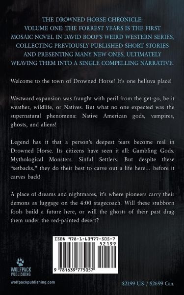 The Drowned Horse Chronicle: Volume 1: The Forrest Years is the first mosaic novel in David Boop's Weird Western series, collecting previously published short stories and presenting many new ones, ultimately weaving them into a single compelling narrative. Welcome to the town of Drowned Horse! It's one helluva place! Westward expansion was fraught with peril from the get-go, be it weather, wildlife, or Natives. But what no one expected was the supernatural phenomena: Native American gods, vampires, ghosts, and aliens! Legend has it that a person's deepest fears become real in Drowned Horse. Its citizens have seen it all: Gambling Gods. Mythological Monsters. Sinful Settlers. But despite these "setbacks," they do their best to carve out a life here...before it carves back! A place of dreams and nightmares, it's where pioneers carry their demons as luggage on the 4:00 stagecoach. Will these stubborn fools build a future here, or will the ghosts of their past drag them under the red-painted desert? Standing between the dark and the light is one brave sheriff...