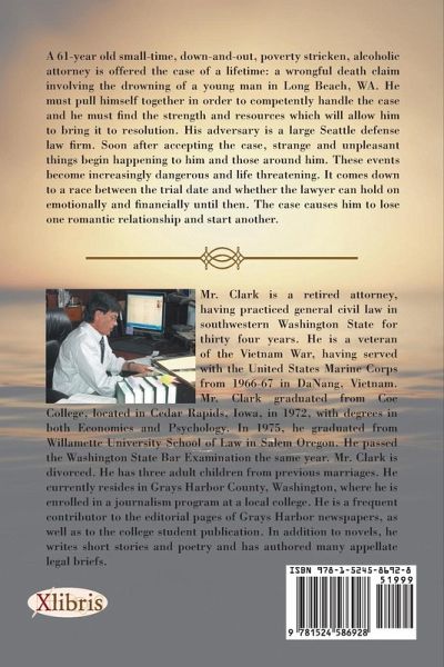 A small-time, down-and-out, poverty-stricken, alcoholic sixty-one-year-old attorney is offered the case of a lifetime: a wrongful death claim involving the drowning of a young man in Long Beach, Washington. He must pull himself together in order to competently handle the case, and he must find the strength and resources that will allow him to bring it to resolution. His adversary is a large Seattle defense law firm. Soon after accepting the case, strange and unpleasant things begin happening to him and those around him. These events become increasingly dangerous and life-threatening. It comes down to a race between the trial date and whether the lawyer can hold on emotionally and financially until then. The case causes him to lose one romantic relationship and start another.