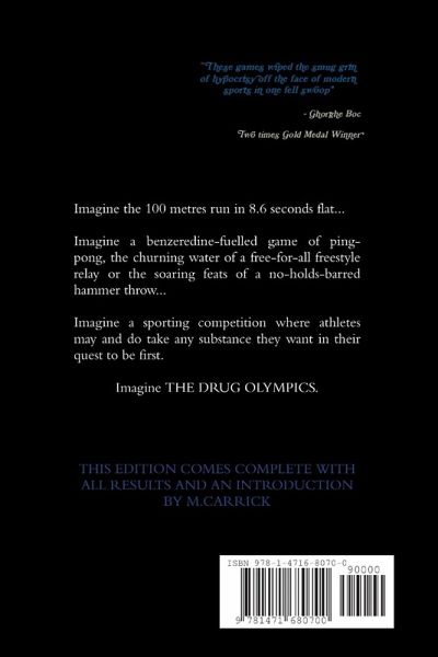 Imagine the 100 metres run in 8.6 seconds flat... Imagine a benzeredine-fuelled game of ping-pong, the churning water of the freestyle relay or the soaring feats of the hammer throw... Imagine THE DRUG OLYMPICS, a sporting competition where athletes may and do take any substance they want in their quest to be first.