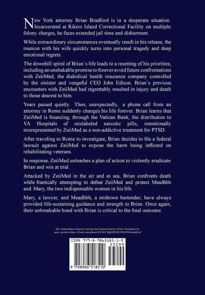 New York attorney Brian Bradford is in a desperate situation. Incarcerated at Rikers Island Correctional Facility on multiple felony charges, he faces extended jail time and disbarment. While extraordinary circumstances eventually result in his release, the reunion with his wife quickly turns into personal tragedy and deep emotional regrets. The downhill spiral of Brian's life leads to a resetting of his priorities, including an unshakable promise to forever avoid future confrontations with ZeiiMed, the diabolical health insurance company controlled by the sinister and vengeful CEO John Edison. Brian's previous encounters with ZeiiMed had regrettably resulted in injury and death to those dearest to him. Years passed quietly. Then, unexpectedly, a phone call from an attorney in Rome suddenly changes his life forever. Brian learns that ZeiiMed is financing, through the Vatican Bank, the distribution to VA Hospitals of mislabeled narcotic pills, falsely misrepresented by ZeiiMed as a non-addictive treatment for PTSD. After traveling to Rome to investigate, Brian decides to file a federal lawsuit against ZeiiMed to expose the harm being inflicted on rehabilitating veterans. In response, ZeiiMed unleashes a plan of action to violently eradicate Brian and win at trial. Attacked by ZeiiMed in the air and at sea, Brian confronts death while frantically attempting to defeat ZeiiMed and protect Meadbhb and Mary, the two indispensable women in his life. Mary, a lawyer, and Meadhbh, a midtown bartender, have always provided life-sustaining guidance and strength to Brian. Once again, their unbrakable bond with Brian is critical to the final outcome.