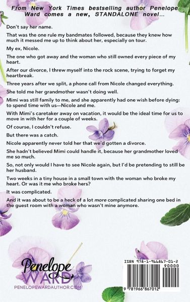 From New York Times bestselling author Penelope Ward comes a new, STANDALONE novel... Don't say her name. That was the one rule my bandmates followed, because they knew how much it messed me up to think about her, especially on tour. My ex, Nicole. The one who got away and the woman who still owned every piece of my heart. After our divorce, I threw myself into the rock scene, trying to forget my heartbreak. Three years after we split, a phone call from Nicole changed everything. She told me her grandmother wasn't doing well. Mimi was still family to me, and she apparently had one wish before dying: to spend time with us-Nicole and me. With Mimi's caretaker away on vacation, it would be the ideal time for us to move in with her for a couple of weeks. Of course, I couldn't refuse. But there was a catch. Nicole apparently never told her that we'd gotten a divorce. She hadn't believed Mimi could handle it, because her grandmother loved me so much. So, not only would I have to see Nicole again, but I'd be pretending to still be her husband. Two weeks in a tiny house in a small town with the woman who broke my heart. Or was it me who broke hers? It was complicated. And it was about to be a heck of a lot more complicated sharing one bed in the guest room with a woman who wasn't mine anymore.