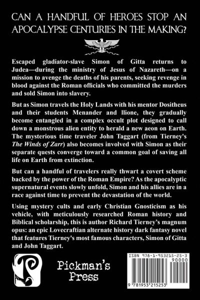 CAN A HANDFUL OF HEROES STOP AN APOCALYPSE CENTURIES IN THE MAKING? Escaped gladiator-slave Simon of Gitta returns to Judea - during the ministry of Jesus of Nazareth - on a mission to avenge the deaths of his parents, seeking revenge in blood against the Roman officials who committed the murders and sold Simon into slavery. But as Simon travels the Holy Lands with his mentor Dositheus and their apprentices Menander and lione, they gradually become entangled in a complex occult plot designed to call down a monstrous alien entity to herald a new aeon on Earth. The mysterious time traveler John Taggart (from Tierney's The Winds of Zarr) also becomes involved with Simon as their separate quests converge toward a common goal of saving all life on Earth from extinction. But can a handful of travelers really thwart a covert scheme backed by the power of the Roman Empire? As the apocalyptic supernatural events slowly unfold, Simon and his allies are in a race against time to prevent the devastation of the world. Using mystery cults and early Christian Gnosticism as his vehicle, with meticulously researched Roman history and Biblical scholarship, this is author Richard Tierney's magnum opus: an epic Lovecraftian alternate history dark fantasy novel that features Tierney's most famous characters, Simon of Gitta and John Taggart. This novel will appeal to fans of historical fantasy and sword & sorcery fiction in the vein of Robert E. Howard, and the elements of cosmic horror and the Cthulhu Mythos will satisfy many fans of H.P. Lovecraft.