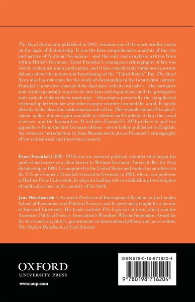 Jens Meierhenrich is Associate Professor of International Relations at the London School of Economics and Political Science His books include Genocide: A Very Short Introduction and Genocide: A Reader (both forthcoming from Oxford University Press in 2014). Ernst Fraenkel (1898--1975) was an eminent political scientist who began his professional career as a labor lawyer in Weimar Germany. Forced to flee the Nazi dictatorship in 1938, he emigrated to the United States and worked as an adviser to the U.S. government. Fraenkel returned to Germany in 1951, where, as a professor at Berlins Freie Universität, he played a leading role in establishing the discipline of political science in the country of his birth.