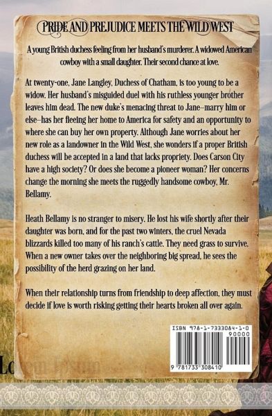 Pride and Prejudice meets the Wild WestA young British duchess fleeing from her husband's murderer. A widowed American cowboy with a small daughter. Their second chance at love.At twenty-one, Jane Langley the Duchess of Chatham, is too young to be a widow. Her husband's misguided duel with his ruthless younger brother leaves him dead. The new duke's menacing threat to Jane-marry him or else-has her fleeing her home to America for safety and an opportunity to where she can buy her own property. Although Jane worries about her new role as a landowner in the Wild West, she wonders if a proper British duchess will be accepted in a land that lacks propriety. Does Carson City have a high society? Or does she become a pioneer woman? Her concerns change the morning she meets the ruggedly handsome cowboy, Mr. Bellamy.Heath Bellamy is no stranger to misery. He lost his wife shortly after their daughter was born, and for the past two winters, the cruel Nevada blizzards killed too many of his ranch's cattle. They need grass to survive. When a new owner takes over the neighboring big spread, he sees the possibility of the herd grazing on her land. When their relationship turns from friendship to deep affection, they must decide if love is worth risking getting their hearts broken all over again."The Duchess and the Cowboy" is a historical romance novel of approximate 66,000 words. No cheating. No cliffhangers, and a guaranteed Happily Ever After!
