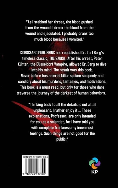 KORSGAARD PUBLISHING has republished Dr. Karl Berg's timeless classic, THE SADIST. After his arrest, Peter Kürten, the Düsseldorf Vampire, allowed Dr. Berg to dive into his mind. The result was this book. Never before has a serial killer spoken so openly and candidly about his murders, fantasies, and motivations. This book is a must read, but only for those who dare traverse the journey of the darkest of human behaviors.