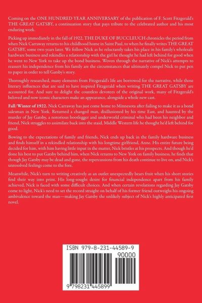 Coming on the ONE HUNDRED YEAR ANNIVERSARY of the publication of F. Scott Fitzgerald's THE GREAT GATSBY, a continuation story that pays tribute to the celebrated author and his most enduring work. Picking up immediately in the fall of 1922, THE DUKE OF BUCCLEUCH chronicles the period from when Nick Carraway returns to his childhood home in Saint Paul, to when he finally writes THE GREAT GATSBY, some two years later. We follow Nick as he reluctantly takes his place in his family's wholesale hardware business and rekindles a relationship with the girl he thought he had left behind for good when he went to New York to take up the bond business. Woven through the narrative of Nick's attempts to reassert his independence from his family are the circumstances that ultimately compel Nick to put pen to paper in order to tell Gatsby's story. Thoroughly researched, many elements from Fitzgerald's life are borrowed for the narrative, while those literary influences that are said to have inspired Fitzgerald when writing THE GREAT GATSBY are accounted for. And sure to delight the countless devotees of the original work, many of Fitzgerald's beloved and now iconic characters make an appearance, alongside a whole new cast. Fall/Winter of 1922. Nick Carraway has just come home to Minnesota after failing to make it as a bond salesman in New York. Returned a changed man, disillusioned by his time East, and haunted by the murder of Jay Gatsby, a notorious bootlegger and underworld criminal who had been his neighbor and friend, Nick struggles to assimilate back into the staid, Middle Western life he thought he'd left behind for good. Bowing to the expectations of family and friends, Nick ends up back in the family hardware business and finds himself in a rekindled relationship with his longtime girlfriend, Anne. His entire future being decided for him, with him having little input in the matter, Nick bristles at his prospects. And though he'd done his best to put Gatsby behind him, when Nick returns to New York on family business, he finds that though Jay Gatsby may be dead and gone, the repercussions from his death continue to live on, and Nick's unresolved feelings come to the fore. Meanwhile, Nick's turn to writing creatively as an outlet unexpectedly bears fruit when his short stories find their way into print. His long-sought desire for financial independence apart from his family achieved, Nick is faced with some difficult choices. And when certain revelations regarding Jay Gatsby come to light, Nick's need to set the record straight on behalf of his former friend outweighs his ongoing ambivalence toward the man-making Jay Gatsby the unlikely subject of Nick's highly anticipated first novel.