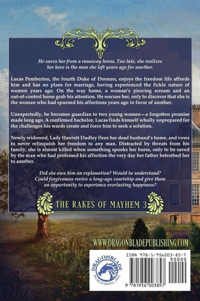 He saves her from a runaway horse. Too late, she realizes her hero is the man she left years ago for another. Lucas Pemberton, the fourth Duke of Dorman, enjoys the freedom life affords him and has no plans for marriage, having experienced the fickle nature of women years ago. On the way home, a woman's piercing scream and an out-of-control horse grab his attention. He rescues her, only to discover that she is the woman who had spurned his affections years ago in favor of another. Unexpectedly, he becomes guardian to two young women-a forgotten promise made long ago. A confirmed bachelor, Lucas finds himself wholly unprepared for the challenges his wards create and force him to seek a solution. Newly widowed, Lady Harriett Dudley flees her dead husband's home, and vows to never relinquish her freedom to any man. Distracted by threats from his family, she is almost killed when something spooks her horse, only to be saved by the man who had professed his affection the very day her father betrothed her to another. Did she owe him an explanation? Would he understand? Could forgiveness revive a long-ago courtship and give them an opportunity to experience everlasting happiness? The Rakes of Mayhem The Earl of Excess The Marquess of Mischief The Duke of Disorder