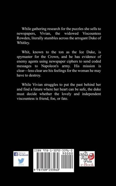 While gathering research for the puzzles she sells to newspapers, Vivian, the widowed Viscountess Rowden, literally stumbles across the arrogant Duke of Whitley. Whit, known to the ton as the Ice Duke, is spymaster for the Crown, and he has evidence of enemy agents using newspaper ciphers to send coded messages to Napoleon's army. His mission is clear -- less clear are his feelings for the woman he may have to destroy. While Vivian struggles to put the past behind her and find a future where her heart can be safe, the duke must decide whether the lovely and independent viscountess is friend, foe, or fate.