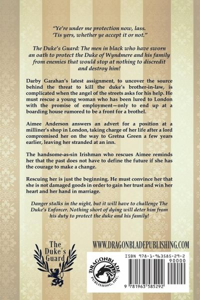 "Ye're under me protection now, lass. 'Tis yers, whether ye accept it or not." The Duke's Guard: The men in black who have sworn an oath to protect the Duke of Wyndmere and his family from enemies that would stop at nothing to discredit and destroy him! Darby Garahan's latest assignment, to uncover the source behind the threat to kill the duke's brother-in-law, is complicated when the angel of the streets asks for his help. He must rescue a young woman who has been lured to London with the promise of employment-only to end up at a boarding house rumored to be a front for a brothel. Aimee Anderson answers an advert for a position at a milliner's shop in London, taking charge of her life after a lord compromised her on the way to Gretna Green a few years earlier, leaving her stranded at an inn. The handsome-as-sin Irishman who rescues Aimee reminds her that the past does not have to define the future if she has the courage to make a change. Rescuing her is just the beginning. He must convince her that she is not damaged goods in order to gain her trust and win her heart and her hand in marriage. Danger stalks in the night, but it will have to challenge The Duke's Enforcer. Nothing short of dying will deter him from his duty to protect the duke and his family! The Duke's Guard Book 1 - The Duke's Sword Book 2 - The Duke's Protector Book 3 - The Duke's Shield Book 4 - The Duke's Dragoon Book 5 - The Duke's Hammer Book 6 - The Duke's Defender Book 7 - The Duke's Saber Book 8 - The Duke's Enforcer Book 9 - The Duke's Mercenary Book 10 - The Duke's Rapier Book 11 - The Duke's Man-at-Arms Book 12 - The Duke's Lance Book 13 - The Duke's Champion Book 14 - The Duke's Sharpshooter Book 15 - The Duke's Cavalier Book 16 - The Duke's Blade