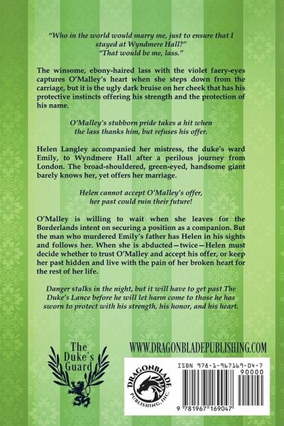 "Who in the world would marry me, just to ensure that I stayed at Wyndmere Hall?" "That would be me, lass." The winsome, ebony-haired lass with the violet faery-eyes captures O'Malley's heart when she steps down from the carriage, but it is the ugly dark bruise on her cheek that has his protective instincts offering his strength and the protection of his name. O'Malley's stubborn pride takes a hit when the lass thanks him, but refuses his offer. Helen Langley accompanied her mistress, the duke's ward Emily, to Wyndmere Hall after a perilous journey from London. The broad-shouldered, green-eyed, handsome giant barely knows her, yet offers her marriage. Helen cannot accept O'Malley's offer, her past could ruin their future! O'Malley is willing to wait when she leaves for the Borderlands intent on securing a position as a companion. But the man who murdered Emily's father has Helen in his sights and follows her. When she is abducted-twice-Helen must decide whether to trust O'Malley and accept his offer, or keep her past hidden and live with the pain of her broken heart for the rest of her life. Danger stalks in the night, but it will have to get past The Duke's Lance before he will let harm come to those he has sworn to protect with his strength, his honor, and his heart.