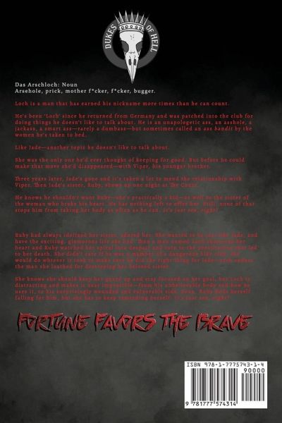 Das Arschloch: Noun Arsehole, prick, mother f*cker, f*cker, bugger. Loch is a man that has earned his nickname more times than he can count. He's been 'Loch' since he returned from Germany and was patched into the club for doing things he doesn't like to talk about. He is an unapologetic ass, an asshole, a jackass, a smart ass-rarely a dumbass-but sometimes called an ass bandit by the women he's taken to bed. Like Jade-another topic he doesn't like to talk about. She was the only one he'd ever thought of keeping for good. But before he could make that move, she'd disappeared-with Viper, his younger brother. Three years later, Jade's gone, and it's taken a lot to mend the relationship with Viper. Then Jade's sister, Ruby, shows up one night at The Court. He knows he shouldn't want Ruby-she's practically a kid-as well as the sister of the woman who broke his heart. He has nothing left to offer her. Still, none of that stops him from taking her body as often as he can. It's just sex, right? Ruby had always idolized her sister, adored her. She wanted to be just like Jade, and have the exciting, glamorous life she had. Then a man named Loch shattered her heart and Ruby watched her spiral into despair and turn to the prostitution that led to her death. She didn't care if he was a member of a dangerous bike club, she would do whatever it took to make sure he did the right thing for Jade-even seduce the man she loathed for destroying her beloved sister. She knows she should keep her guard up and stay focused on her goal, but Loch is distracting and makes it near impossible-from his unbelievable body and how he uses it, to his surprisingly wounded and vulnerable side. Soon, Ruby finds herself falling for him, but she has to keep reminding herself: It's just sex, right? Fortune Favors the Brave