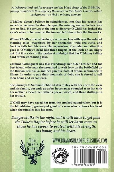 A lecherous lord out for revenge and the black sheep of the O'Malley family complicate this Regency Romance on the Duke's Guard's latest assignment-to find a missing woman. O'Malley doesn't believe in coincidences, nor that his cousin has somehow managed to stumble upon the missing woman he has been sent to find. He arrives at the inn to discover O'Ghill has locked the vicar's niece in her room at the inn and left him to face the fireworks. When O'Malley opens the door, a winsome lass with eyes the color of morning mist-magnified by her spectacles-wild red curls, and freckles falls into his arms. Her expression of wonder and attraction goes to O'Malley's head like three fingers of the Irish on an empty gut. But it is a kiss in the garden at midnight that has O'Malley falling hard for the enchanting lass. Caroline Gillingham has lost everything: her older brother and his best friend-the man she promised to wait for-on the battlefield on the Iberian Peninsula, and her parents, both of whom succumbed to illness. In order to pay their mountain of debt, she is forced to sell their home and its contents. She journeys to Summerfield-on-Eden to stay with her uncle the vicar and his family, but ends up a few hours away stranded at an inn with her mother's locket, her father's pocket watch, and three shillings in her reticule. O'Ghill may have saved her from the crooked pawnbroker, but it is the blond-haired, green-eyed giant of a man who captures her heart when she tumbles into his arms. Danger stalks in the night, but it will have to get past the Duke's Rapier before he will let harm come to those he has sworn to protect with his strength, his honor, and his heart.
