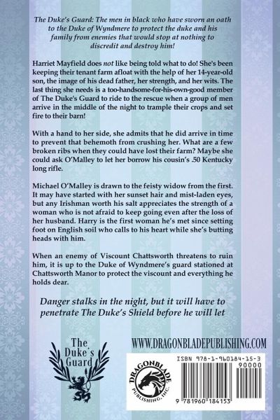 The Duke's Guard: The men in black who have sworn an oath to the Duke of Wyndmere to protect the duke and his family from enemies that would stop at nothing to discredit and destroy him! Harriet Mayfield does not like being told what to do! She's been keeping their tenant farm afloat with the help of her 14-year-old son, the image of his dead father, her strength, and her wits. The last thing she needs is a too-handsome-for-his-own-good member of The Duke's Guard to ride to the rescue when a group of men arrive in the middle of the night to trample their crops and set fire to their barn! With a hand to her side, she admits that he did arrive in time to prevent that behemoth from crushing her. What are a few broken ribs when they could have lost their farm? Maybe she could ask O'Malley to let her borrow his cousin's .50 Kentucky long rifle. Michael O'Malley is drawn to the feisty widow from the first. It may have started with her sunset hair and mist-laden eyes, but any Irishman worth his salt appreciates the strength of a woman who is not afraid to keep going even after the loss of her husband. Harry is the first woman he's met since setting foot on English soil who calls to his heart while she's butting heads with him. When an enemy of Viscount Chattsworth threatens to ruin him, it is up to the Duke of Wyndmere's guard stationed at Chattsworth Manor to protect the viscount and everything he holds dear. Danger stalks in the night, but it will have to penetrate The Duke's Shield before he will let them harm those he has sworn to protect with his strength, his heart, and his honor. The Duke's Guard Book 1 - The Duke's Sword Book 2 - The Duke's Protector Book 3 - The Duke's Shield Book 4 - The Duke's Dragoon Book 5 - The Duke's Hammer Book 6 - The Duke's Defender Book 7 - The Duke's Saber Book 8 - The Duke's Enforcer Book 9 - The Duke's Mercenary Book 10 - The Duke's Rapier Book 11 - The Duke's Man-at-Arms Book 12 - The Duke's Lance Book 13 - The Duke's Champion Book 14 - The Duke's Sharpshooter Book 15 - The Duke's Cavalier Book 16 - The Duke's Blade
