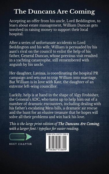 Accepting an offer from his uncle, Lord Beddington, to learn about estate management, William Duncan gets involved in raising money to support their local hospital. After a series of unfortunate accidents to Lord Beddington and his wife, William is persuaded by his aunt's rival on the council to enlist the help of his father, General Duncan, whose previous visit resulted in a yachting catastrophe, still remembered with anguish by his uncle. Her daughter, Lavinia, is coordinating the hospital PR campaign and sets out to trap William into marriage. But William is in love with Kate, the daughter of an extreme left-wing councillor. Luckily, help is at hand in the shape of Algy Frobisher, the General's ADC, who turns up to help him out of a number of dramatic encounters, including dealing with his father's escalating Mess bills, a dramatic air rescue and the hunt for an elusive treasure that he hopes will solve all their problems and win back his love. This is the large print edition of The Duncans Are Coming, with a larger font / typeface for easier reading.¿