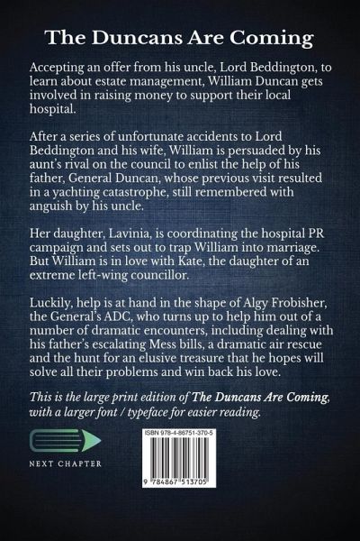 Accepting an offer from his uncle, Lord Beddington, to learn about estate management, William Duncan gets involved in raising money to support their local hospital. After a series of unfortunate accidents to Lord Beddington and his wife, William is persuaded by his aunt's rival on the council to enlist the help of his father, General Duncan, whose previous visit resulted in a yachting catastrophe, still remembered with anguish by his uncle. Her daughter, Lavinia, is coordinating the hospital PR campaign and sets out to trap William into marriage. But William is in love with Kate, the daughter of an extreme left-wing councillor. Luckily, help is at hand in the shape of Algy Frobisher, the General's ADC, who turns up to help him out of a number of dramatic encounters, including dealing with his father's escalating Mess bills, a dramatic air rescue and the hunt for an elusive treasure that he hopes will solve all their problems and win back his love. This is the large print edition of The Duncans Are Coming, with a larger font / typeface for easier reading.¿