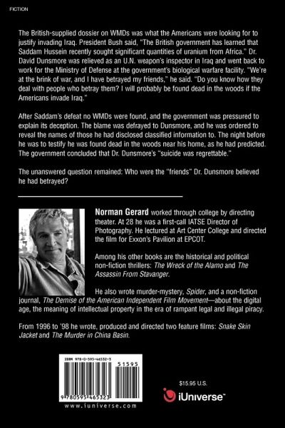 The British-supplied dossier on WMDs was what the Americans were looking for to justify invading Iraq. President Bush said, "The British government has learned that Saddam Hussein recently sought significant quantities of uranium from Africa." Dr. David Dunsmore was relieved as an U.N. weapon's inspector in Iraq and went back to work for the Ministry of Defense at the government's biological warfare facility. "We're at the brink of war, and I have betrayed my friends," he said. "Do you know how they deal with people who betray them? I will probably be found dead in the woods if the Americans invade Iraq." After Saddam's defeat no WMDs were found, and the government was pressured to explain its deception. The blame was defrayed to Dunsmore, and he was ordered to reveal the names of those he had disclosed classified information to. The night before he was to testify he was found dead in the woods near his home, as he had predicted. The government concluded that Dr. Dunsmore's "suicide was regrettable." The unanswered question remained: Who were the "friends" Dr. Dunsmore believed he had betrayed?