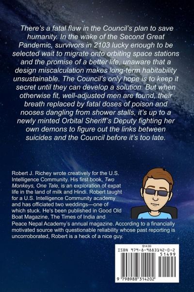 There's a fatal flaw in the Council's plan to save humanity. In the wake of the Second Great Pandemic, survivors in 2103 lucky enough to be selected wait to migrate onto orbiting space stations and the promise of a better life, unaware that a design miscalculation makes long-term habitability unsustainable. The Council's only hope is to keep it secret until they can develop a solution. But when otherwise fit, well-adjusted men are found, their breath replaced by fatal doses of poison and nooses dangling from shower stalls, it's up to a newly minted Orbital Sheriff's Deputy fighting her own demons to figure out the links between suicides and the Council before it's too late.