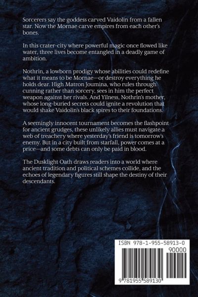 Sorcerers say the goddess carved Vaidolin from a fallen star. Now the Mornae carve empires from each other's bones. In this crater-city where powerful magic once flowed like water, three lives become entangled in a deadly game of ambition. Nothrin, a lowborn prodigy whose abilities could redefine what it means to be Mornae-or destroy everything he holds dear. High Matron Joumina, who rules through cunning rather than sorcery, sees in him the perfect weapon against her rivals. And Yilness, Nothrin's mother, whose long-buried secrets could ignite a revolution that would shake Vaidolin's black spires to their foundations. A seemingly innocent tournament becomes the flashpoint for ancient grudges, these unlikely allies must navigate a web of treachery where yesterday's friend is tomorrow's enemy. But in a city built from starfall, power comes at a price-and some debts can only be paid in blood. The Dusklight Oath draws readers into a world where ancient tradition and political schemes collide, and the echoes of legendary figures still shape the destiny of their descendants. For fans of character-focused high fantasy, political drama, and epic scope. The Dusklight Oath is the first book in the Fifth Accord series. Each book will focus on one of the five Mornae high houses and building to an inevitable conclusion... civil war.