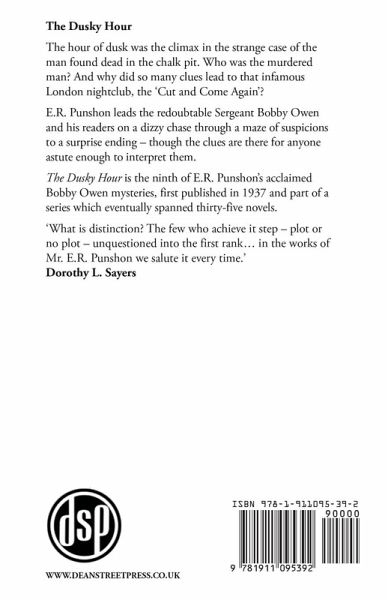 The hour of dusk was the climax in the strange case of the man found dead in the chalk pit. Who was the murdered man? And why did so many clues lead to that infamous London nightclub, the ‘Cut and Come Again’? E.R. Punshon leads the redoubtable Sergeant Bobby Owen and his readers on a dizzy chase through a maze of suspicions to a surprise ending – though the clues are there for anyone astute enough to interpret them. The Dusky Hour is the ninth of E.R. Punshon’s acclaimed Bobby Owen mysteries, first published in 1937 and part of a series which eventually spanned thirty-five novels. "What is distinction? The few who achieve it step – plot or no plot – unquestioned into the first rank… in the works of Mr. E.R. Punshon we salute it every time." Dorothy L. Sayers