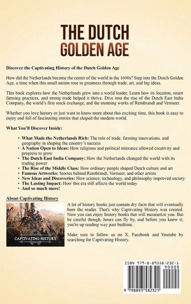 Discover the Captivating History of the Dutch Golden Age How did the Netherlands become the center of the world in the 1600s? Step into the Dutch Golden Age, a time when this small nation rose to greatness through trade, art, and big ideas. This book explores how the Netherlands grew into a world leader. Learn how its location, smart farming practices, and strong trade helped it thrive. Dive into the rise of the Dutch East India Company, the world's first stock exchange, and the stunning works of Rembrandt and Vermeer. Whether you love history or just want to know more about this exciting time, this book is easy to enjoy and full of fascinating stories that shaped the modern world. What You'll Discover Inside: What Made the Netherlands Rich: The role of trade, farming innovations, and geography in shaping the country's success A Nation Open to Ideas: How religious and political tolerance allowed creativity and progress to grow The Dutch East India Company: How the Netherlands changed the world with its trading power The Rise of the Middle Class: How ordinary people shaped Dutch culture and art Famous Artworks: Stories behind Rembrandt, Vermeer, and other artists New Ideas and Discoveries: How science, technology, and philosophy improved society The Lasting Impact: How this era still affects the world today And so much more!