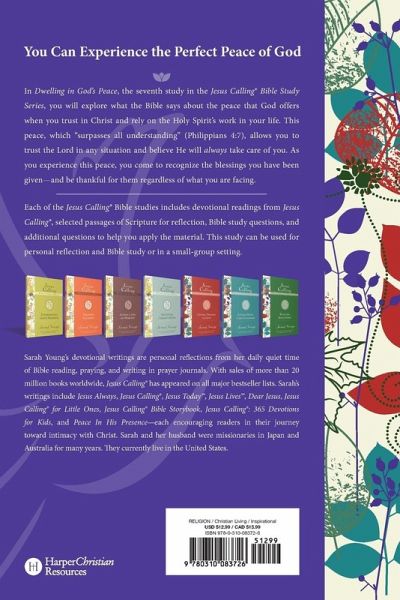 In Dwelling in God's Peace, the seventh study in the Jesus Calling Bible Study Series, you will explore what the Bible says about the peace that God offers when you trust in Christ and rely on the Holy Spirit's work in your life. This peace, which "surpasses all understanding" (Philippians 4:7), allows you to trust the Lord in any situation and believe He will always take care of you. As you experience this peace, you come to recognize the blessings you have been given-and be thankful for them regardless of what you are facing. Sessions Include: God's Peace Through Faith in Christ God's Peace Through Obedience to Christ God's Peace Through the Work of the Holy Spirit God's Peace in the Midst of Suffering God's Peace Among Believers in Christ God's Peace Through the Practice of Prayer God's Peace Through Inheritance in Christ God's Peace Through Spiritual Discipline Each of the Jesus Calling Bible studies includes devotional readings from Jesus Calling, selected passages of Scripture for reflection, Bible study questions, and additional questions to help you apply the material. This study can be used for personal reflection and Bible study or in a small-group setting.