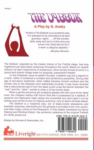 The Dybbuk, regarded as the classic drama of the Yiddish stage, has long frightened yet fascinated audiences throughout the world. Based on Jewish folklore, its dark implications of mysterious, other-worldly forces at work in a quaint and simple village make for gripping, suspenseful theater. To the Chassidic Jews of eastern Europe, a dybbuk was not a legend or a myth; rather it remained a constant and portentous possibility. During that age of pervasive mysticism, when rabbis became miracle workers and the sinister arts of the Kabbala were fearsomely invoked, it was never doubted that a discontented spirit from the dead could cross the barrier between the "real" and the "other" worlds to enter a living human body. The Dybbuk is a masterful play, full of deep-rooted obsessions and dramatic suspense, fascinating for the glimpse it provides of the rich, poetic, and often tragic culture of the Chassidim. In this classic translation by Henry Alsberg and Winifred Katzin, the authentic cadences of the original Yiddish are deftly preserved.