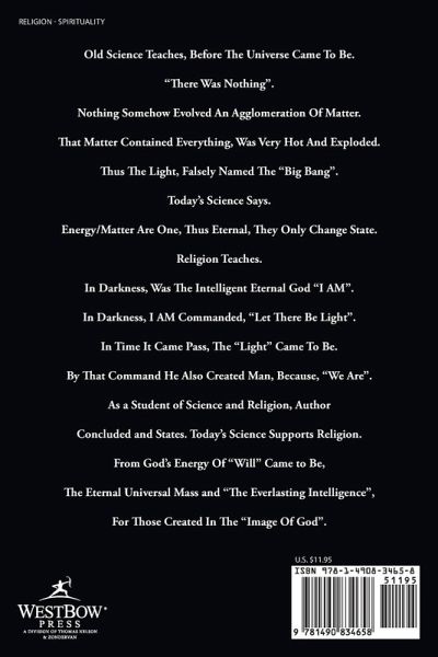 Old Science Teaches, Before The Universe Came To Be. "There Was Nothing". Nothing Somehow Evolved An Agglomeration Of Matter. That Matter Contained Everything, Was Very Hot And Exploded. Thus The Light, Falsely Named The "Big Bang". Today's Science Says. Energy/Matter Are One, Thus Eternal, They Only Change State. Religion Teaches. In Darkness, Was The Intelligent Eternal God "I AM". In Darkness, I AM Commanded, "Let There Be Light". In Time It Came Pass, The "Light" Came To Be. By That Command He Also Created Man, Because, "We Are". As a Student of Science and Religion, Author Concluded and States. Today's Science Supports Religion. From God's Energy Of "Will" Came to Be, The Eternal Universal Mass and "The Everlasting Intelligence", For Those Created In The "Image Of God".