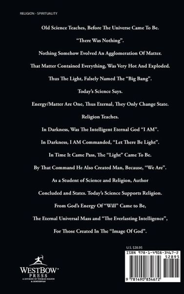 Old Science Teaches, Before The Universe Came To Be. "There Was Nothing". Nothing Somehow Evolved An Agglomeration Of Matter. That Matter Contained Everything, Was Very Hot And Exploded. Thus The Light, Falsely Named The "Big Bang". Today's Science Says. Energy/Matter Are One, Thus Eternal, They Only Change State. Religion Teaches. In Darkness, Was The Intelligent Eternal God "I AM". In Darkness, I AM Commanded, "Let There Be Light". In Time It Came Pass, The "Light" Came To Be. By That Command He Also Created Man, Because, "We Are". As a Student of Science and Religion, Author Concluded and States. Today's Science Supports Religion. From God's Energy Of "Will" Came to Be, The Eternal Universal Mass and "The Everlasting Intelligence", For Those Created In The "Image Of God".